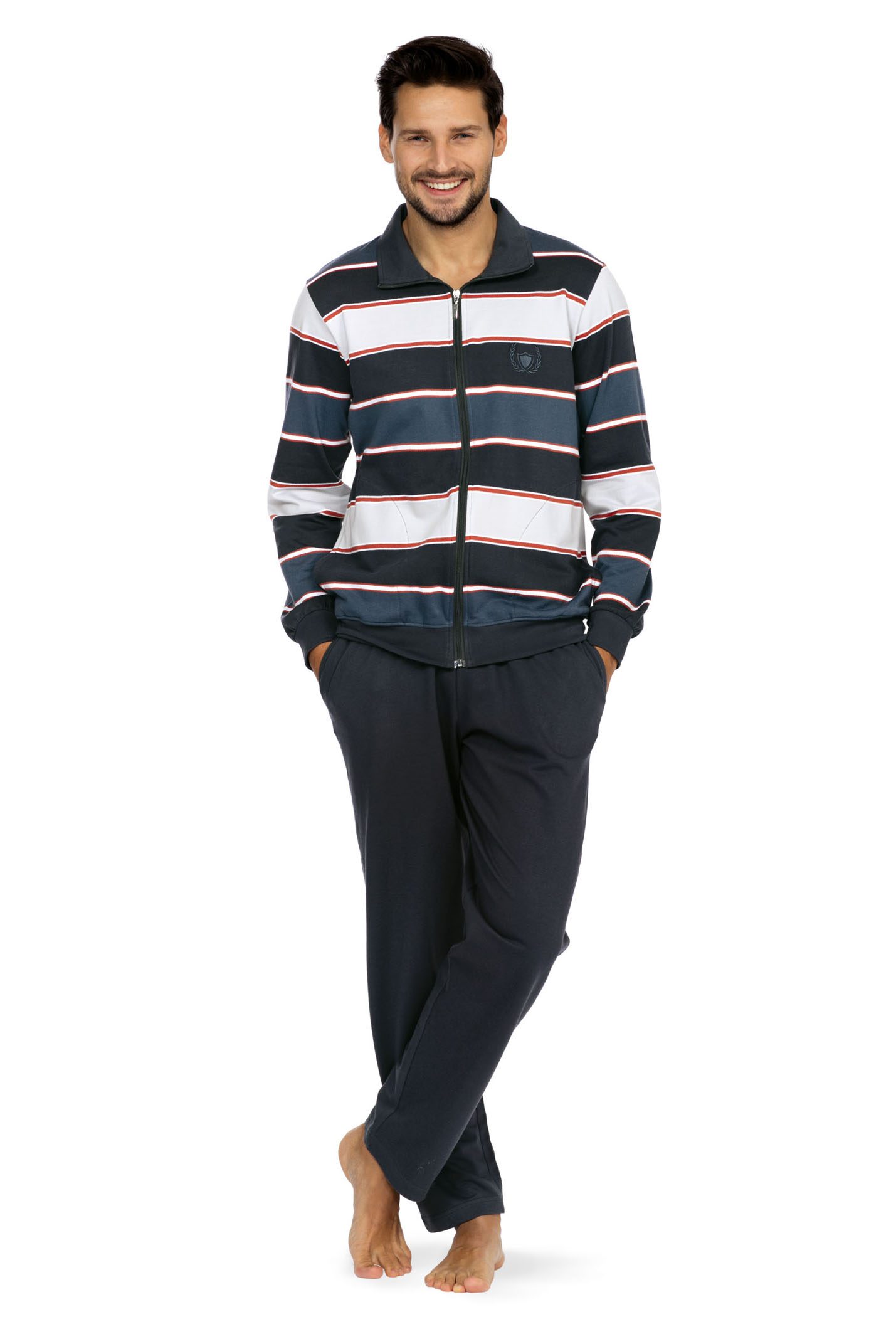 Een heren huispak van het merk Comte met blauw-wit-rood gestreept design. De stijlvolle top heeft een ritssluiting en is voorzien van steekzakken aan beide zijdes. De effen blauw gekleurde lange broek heeft ook steekzakken aan beide zijdes en het heeft een trekkoord in de taille. Door de zachte samenstelling van 80% katoen – 20% polyester is het ideaal te dragen op ieder moment van de dag!