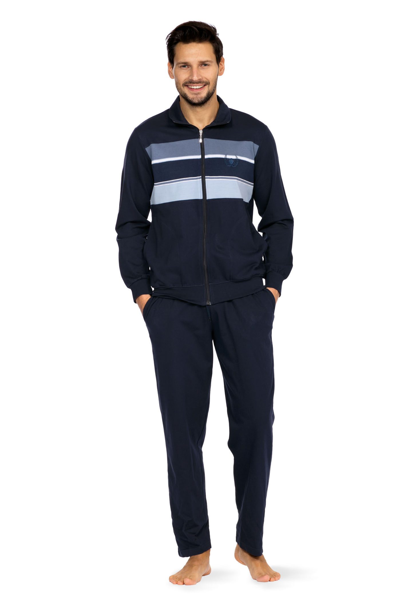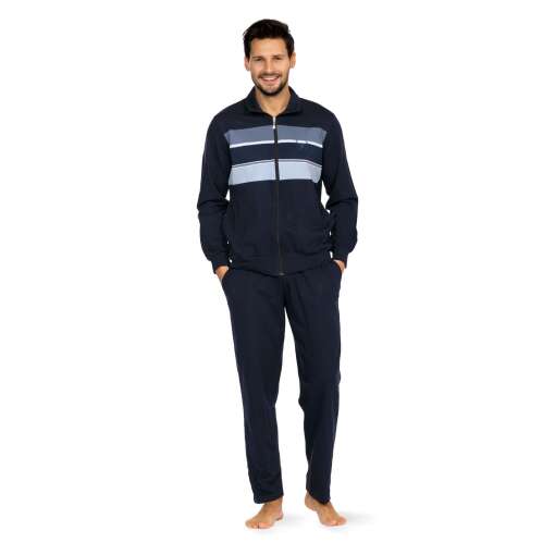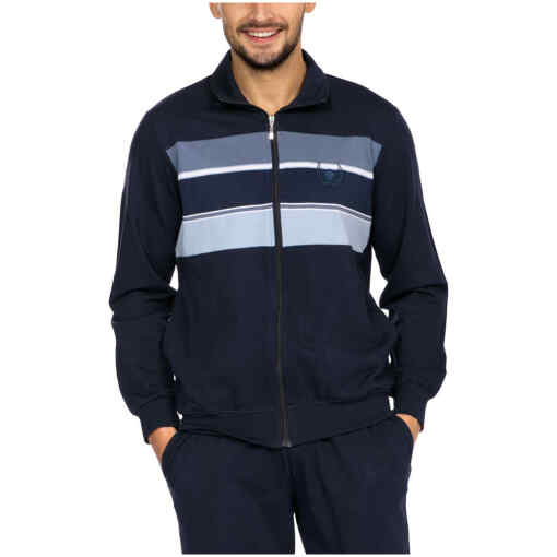 Een heren huispak van het merk Comte met blauw gestreept design. De donker blauwe top heeft een ritssluiting en is voorzien van steekzakken aan beide zijdes. De effen blauw gekleurde lange broek heeft ook steekzakken aan beide zijdes en het heeft een trekkoord in de taille. Door de zachte samenstelling van 80% katoen – 20% polyester is het ideaal te dragen op ieder moment van de dag!