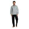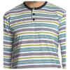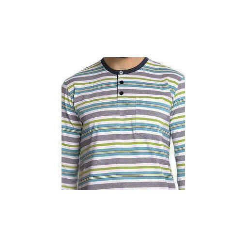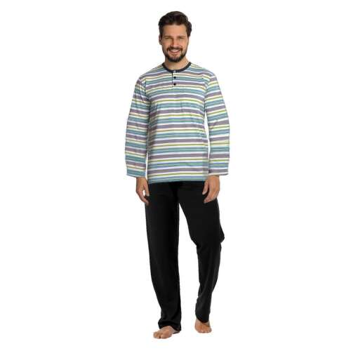 Een frisse zomerse heren pyjama van het merk Comte! De top heeft een gestreept patroon in de kleuren groen-wit-zwart-blauw. Verder heeft de top een ronde hals met een knoopsluiting van 3 knopen die is afgewerkt met een zwarte boord. Dit model is ook voorzien van een borstzakje. De effen zwart gekleurde broek is voorzien van een elastische taille. Gemaakt van 100% katoen! De maat valt groot uit!