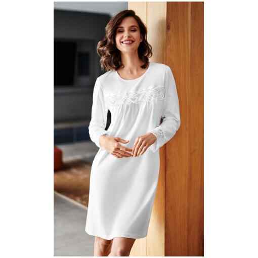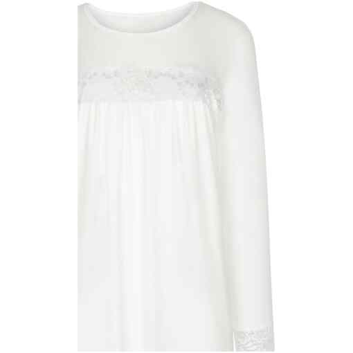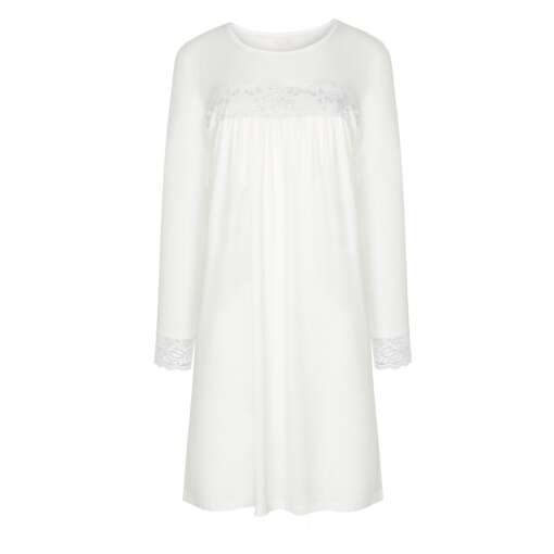Een dames nachthemd uit de Luxurious collectie van Cybèle. Dit stijlvolle ivoor kleurige nachthemd heeft lange mouwen en een perfect pasvorm. De lange mouwen zijn aan de uiteindes stijlvol afgewerkt met kant. Dit nachthemd heeft een ronde hals zonder knoopsluiting. Op de borst zit een prachtig stuk kant en is stijlvol met een plooiing afgewerkt. Het is gemaakt van een zijde zachte 100% Biologische katoen waardoor dit extra fijn draagt. De lengte is 100cm.