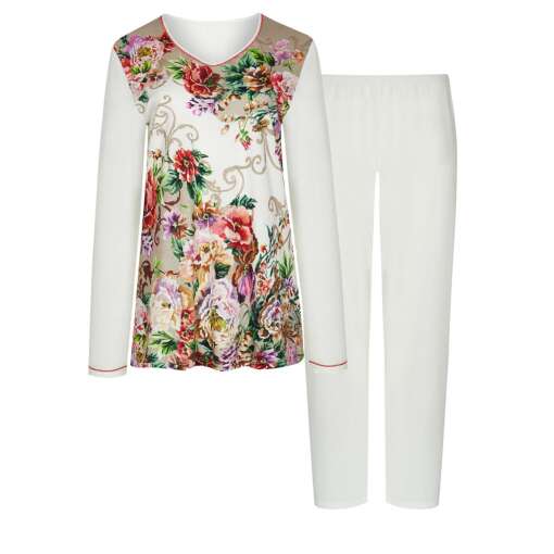 Een gebroken wit gekleurde dames pyjama van het merk Cybèle. De top heeft aan de voorkant een fraai gekleurd bloemen motief en lange mouwen. Het heeft een kleine v-hals zonder een knoopsluiting die met rode stiksel is afgewerkt. Verder heeft de set een effen gebroken wit gekleurde broek met lange pijpen die een elastische rand in de taille heeft. De pyjama is gemaakt van 100% gekamde katoen waardoor het een extra fijne draagcomfort geeft. De top is ongeveer 70cm lang.