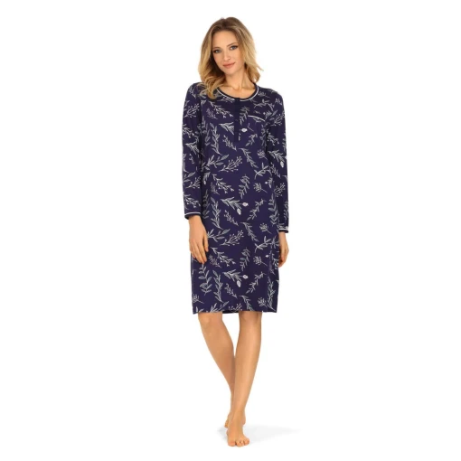 Een sierlijk dames nachthemd van het merk Ascafa uit de ‘Winter Leaves’ collectie. Het donker blauw gekleurde nachthemd heeft lange mouwen en een doorlopend bladeren patroon. De ronde heeft een knoopsluiting van 4 knopen en is stijlvol afgewerkt met een bies. Ook is dit nachthemd voorzien van een borstzakje. Verder is de lengte van dit nachthemd 105cm. Het is gemaakt van een fijne 50% katoen en 50% modal kwaliteit waardoor het zeer veel draagcomfort biedt!