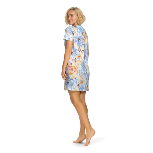 Met korte mouwen en een elegante v-hals, die prachtig is afgewerkt met een delicate bies, biedt dit nachthemd een flatterende pasvorm en een subtiele vrouwelijke touch. De knoopsluiting met twee knopen zorgt voor een speelse en praktische uitstraling, waardoor het gemakkelijk aan en uit te trekken is.