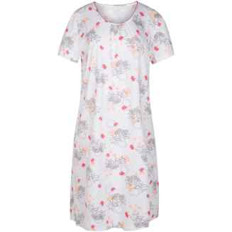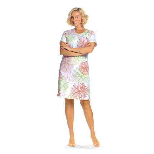 Het licht gekleurde nachthemd is voorzien van een prachtig groen bloemenpatroon dat een frisse en vrouwelijke uitstraling geeft. Met een lengte van 100 cm biedt het nachthemd een ideale bedekking, waardoor je je zowel elegant als comfortabel voelt, of je nu gaat slapen of gewoon lekker ontspant in huis. Gemaakt van 100% single jersey katoen, voelt dit nachthemd heerlijk zacht aan op de huid en zorgt het voor optimale ademend vermogen!
