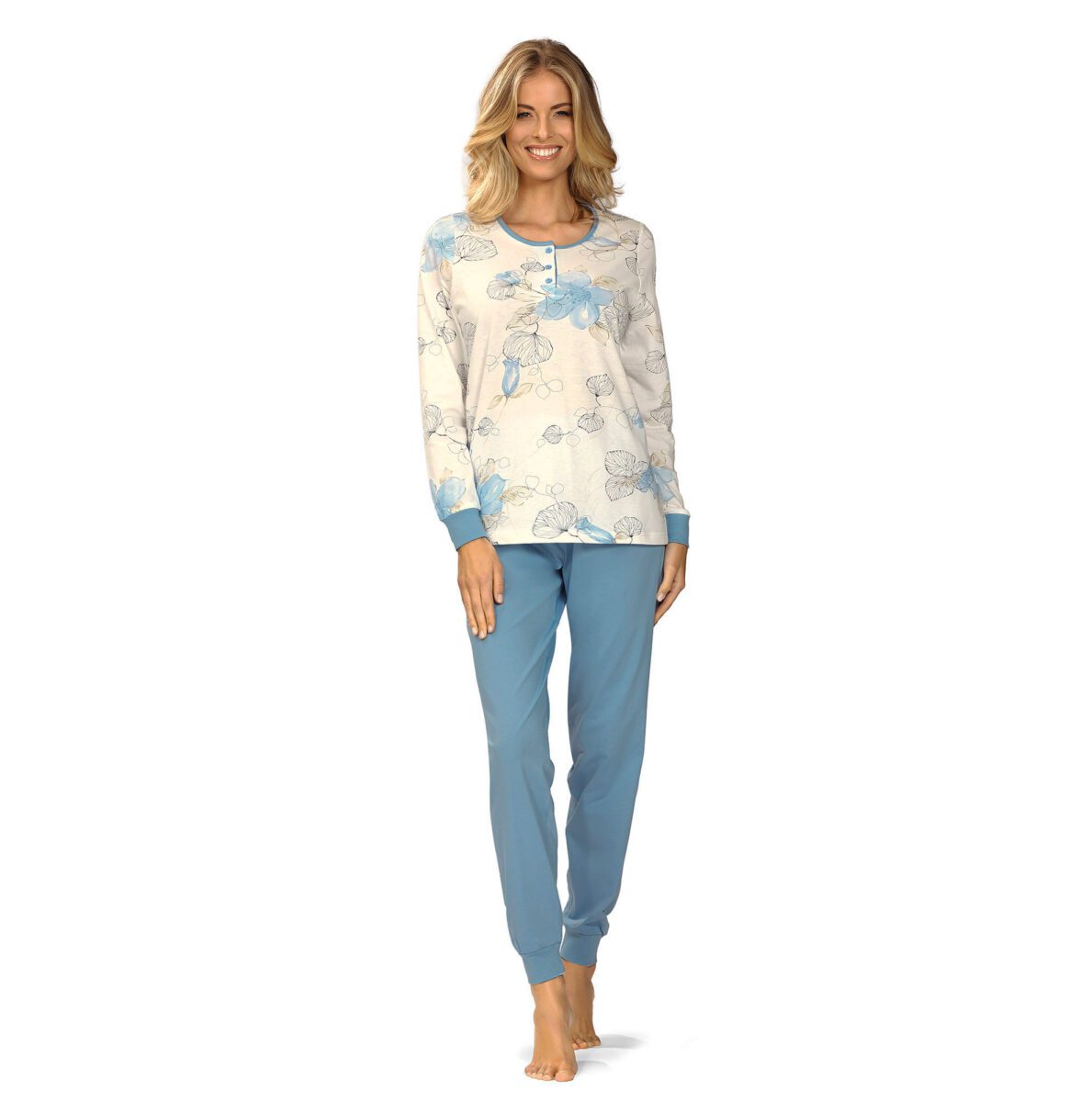 Ontdek de perfecte combinatie van comfort en elegantie met het stijlvolle dames pyjama van Ascafa uit de Natural Lightness collectie. Deze prachtige pyjama is ontworpen met oog voor detail en biedt een luxe uitstraling, ideaal voor een ontspannen avond of een rustige nacht. De top heeft een ronde hals en is voorzien van een verfijnde licht blauwe knoopsluiting met drie knopen, afgewerkt met een subtiele blauwe bies die het geheel een speelse touch geeft.