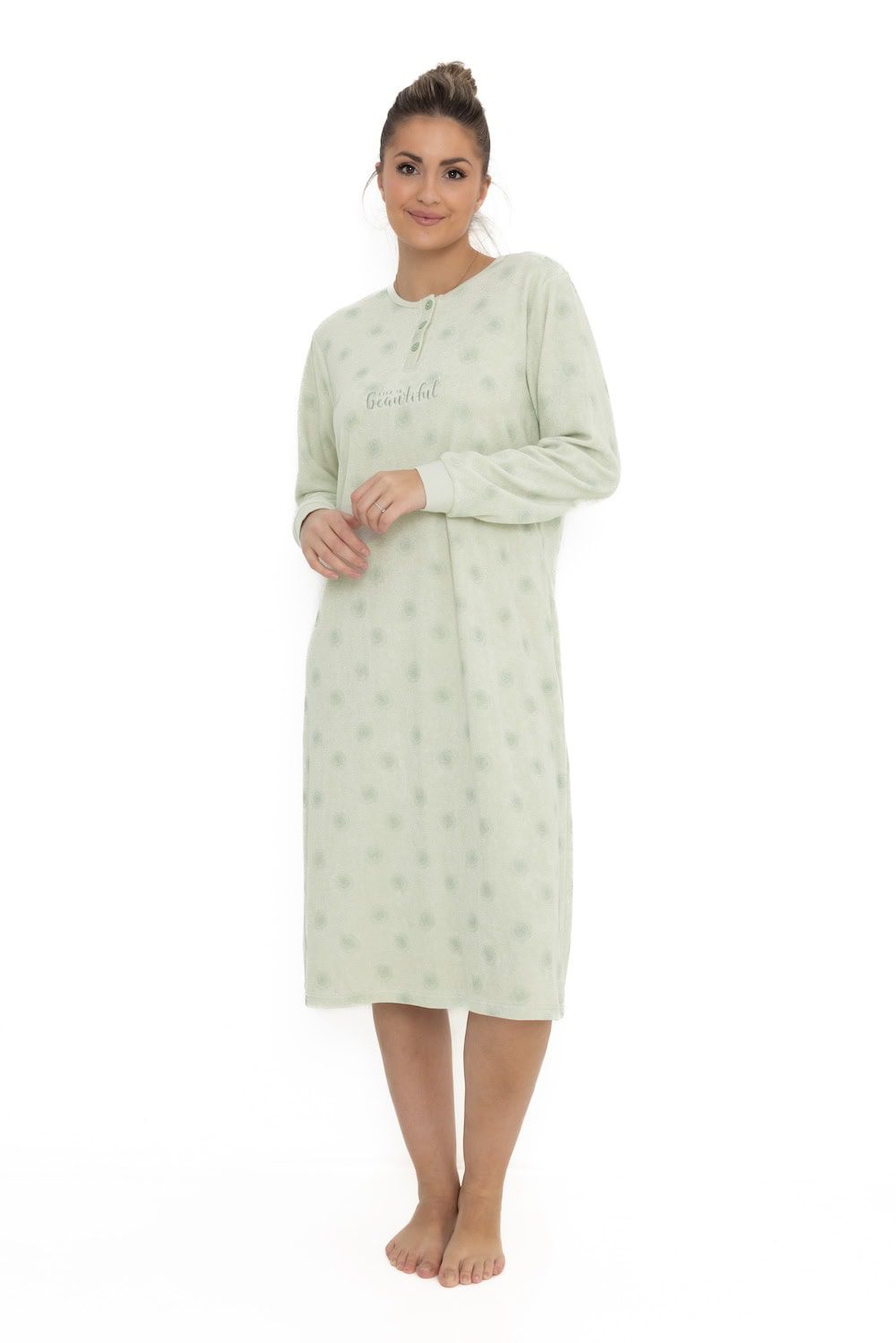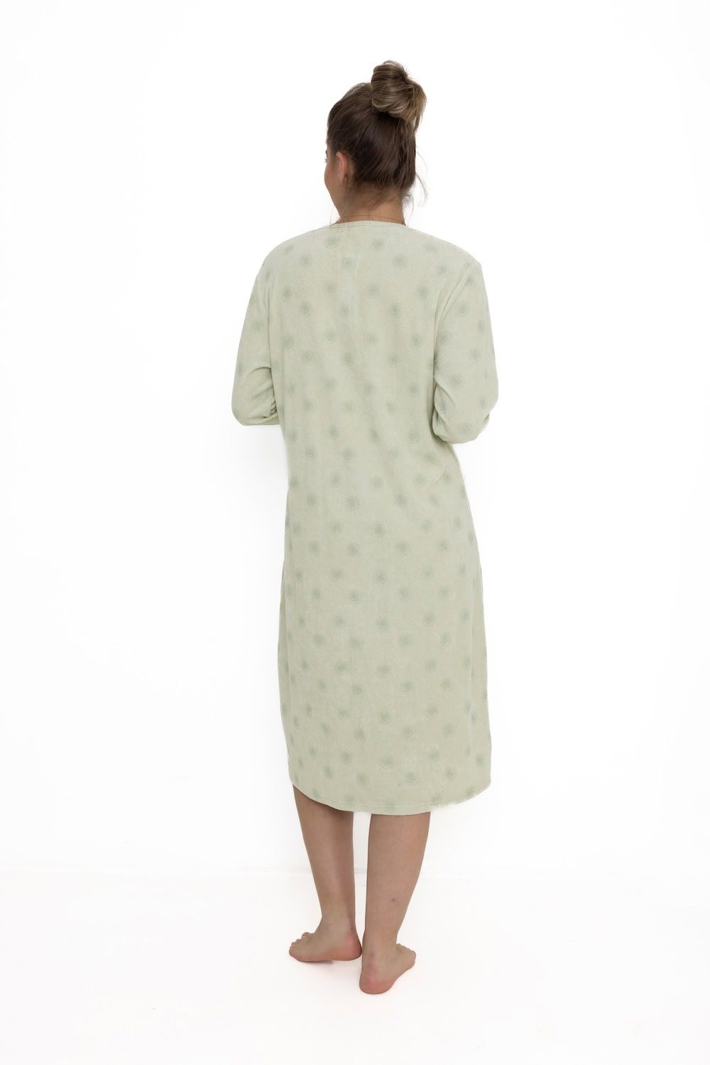 Het nachthemd heeft een lengte over de knie, wat zorgt voor een comfortabel en bedekkend model. De ronde hals is afgewerkt met een knoopsluiting van drie knopen, waardoor het nachthemd makkelijk aan en uit te trekken is en een subtiel vrouwelijk detail krijgt!