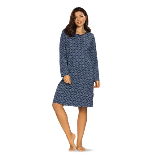 Maak uw nachten warm en comfortabel met het prachtige nachthemd van Comtessa uit de ‘Cosy Snowflake’ collectie. Dit nachthemd met lange mouwen is perfect voor de frissere nachten, zodat u nooit meer koud hoeft te liggen. Gemaakt van een dikke 100% katoenen interlockkwaliteit, biedt dit nachthemd uitzonderlijke warmte en een heerlijk zachte touch. Het donker blauwe ontwerp, verrijkt met een sierlijk grafisch groen gekleurd sneeuwvlokken patroon, brengt een vleugje elegantie in uw nachtroutine.