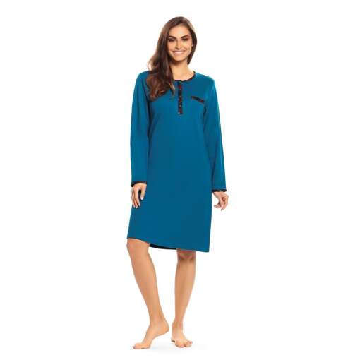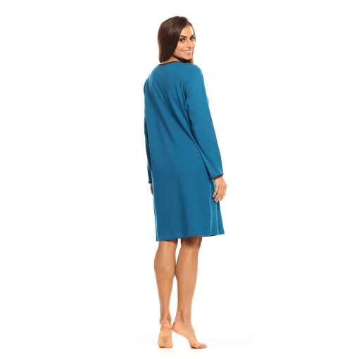 Ga heerlijk warm de nacht door met dit nachthemd van Comtessa uit de ‘Pleasuredome Checks’ collectie. De dikke katoen interlock kwaliteit zorgt er voor dat dit nachthemd extra warmte biedt. De ronde hals heeft een knoopsluiting met 4 knopen en is afgewerkt met een geruit patroon. Verder is dit effen oceaan blauwe nachthemd voorzien van een borstzakje. Gemaakt van 100% katoen interlock en de lengte is 100cm. Met dit nachthemd ben je klaar voor de winterse nachten!