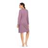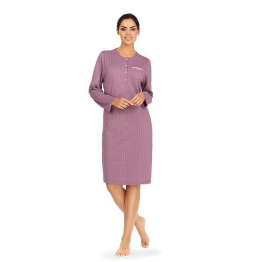 Een stijlvol dames nachthemd uit de ‘Bellevue’ collectie van Comtessa om van een ideale nachtrust te genieten. Dit grape paars gekleurde nachthemd heeft een doorlopend wit gestipt patroon. De ronde hals heeft een knoopsluiting van 4 knopen. Verder is het nachthemd ook voorzien van een borstzakje die met een sierlijk roze strikje is afgewerkt. De lengte is 100cm en het is gemaakt van 100% gekamde katoen. Slaaplekker!