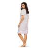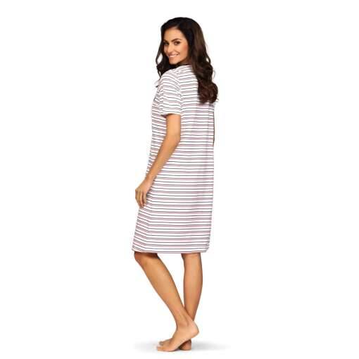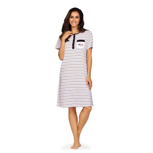 Een Comtessa nachthemd met korte mouwen en gemaakt van 100% katoen. Het wit gekleurde nachthemd heeft een doorlopend gestreept patroon. De ronde hals is stijlvol afgewerkt met een zwarte bies en heeft een knoopsluiting van 4 knopen. Verder is het nachthemd voorzien van een borstzakje waar een opdruk zit van een hond. De lengte van dit nachthemd is 100cm.