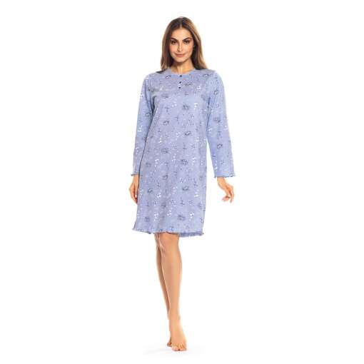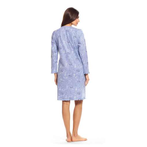 Een fraai blauw gekleurd dames nachthemd van Comtessa met lange mouwen uit de ‘Koi Fish’ collectie. Het nachthemd met doorlopend vissen en bloemen patroon heeft een ronde hals met een knoopsluiting van 3 knopen. Verder is de onderkant van het nachthemd en de uiteindes van de mouwen stijlvol afgewerkt met een rolzoom. Het nachthemd heeft een lengte van 100cm en is gemaakt van puur katoen in een single jersey kwaliteit. Klaar voor de nacht!
