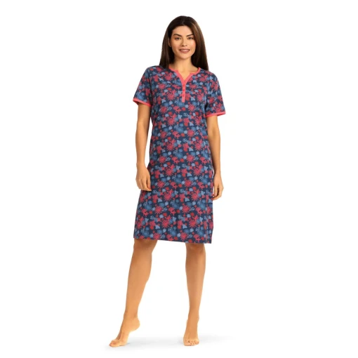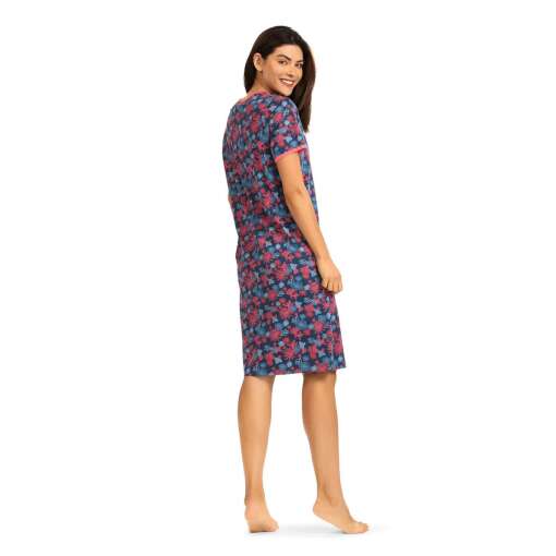 Een fraai dames nachthemd van Comtessa uit de ‘Coral Dreams’ collectie met korte mouwen. Het nachthemd met doorlopend grafisch koraal patroon heeft een perfecte pasvorm. De losse hals heeft een knoopsluiting van 3 knopen en is afgewerkt met een roze rand. De lengte van dit nachthemd is 100cm. Het is gemaakt van 100% single jersey katoen waardoor het een fijn draagcomfort geeft. Een ideaal nachthemd voor de warmere nachten!
