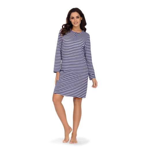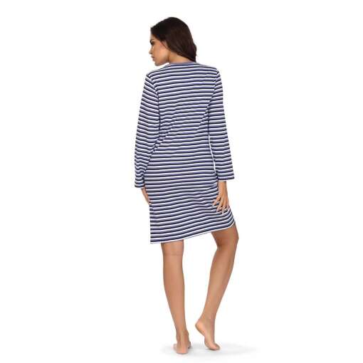 Dames nachthemd met lange mouwen van het merk Comtessa uit de ‘Moon Gazer’ collectie. Het nachthemd heeft een doorlopend denim-wit-zwart gestreept patroon en is voorzien van een ronde hals met een knoopsluiting van 3 knopen. De lengte is 100cm en het is gemaakt van 100% single jersey katoen!