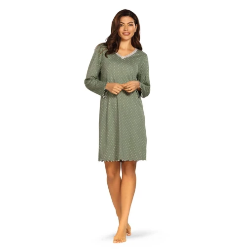 Verwen jezelf met het elegante khaki gekleurde nachthemd uit de Dotty Dots collectie van Comtessa. Dit nachthemd is niet alleen een genot om te dragen, maar ook een lust voor het oog dankzij het speelse gestipte patroon dat een trendy uitstraling geeft. De verfijnde V-hals is prachtig afgewerkt met kant en een schattig strikje, wat zorgt voor een vrouwelijke touch. De lange mouwen zijn comfortabel en stijlvol, met een biesafwerking aan de uiteinden die de look compleet maakt.