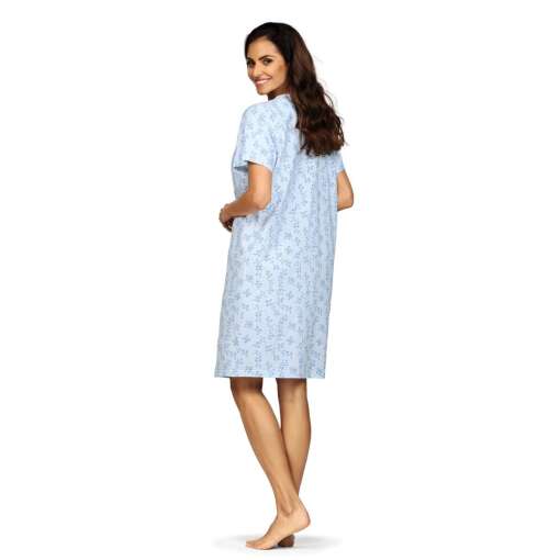 Een verfijnd klassiek dames nachthemd van het merk Comtessa met korte mouwen uit de ‘Esperanza’ collectie. Dit licht blauwe nachthemd heeft een doorlopend bloemen patroon. Het is gemaakt van 100% gekamde katoen. Dit nachthemd heeft een ronde hals met een knoopsluiting van 4 knopen. Aan de bovenkant is het nachthemd met een blauwe bies afgewerkt waardoor het een verfijnde plooiing heeft. De lengte is 105cm.