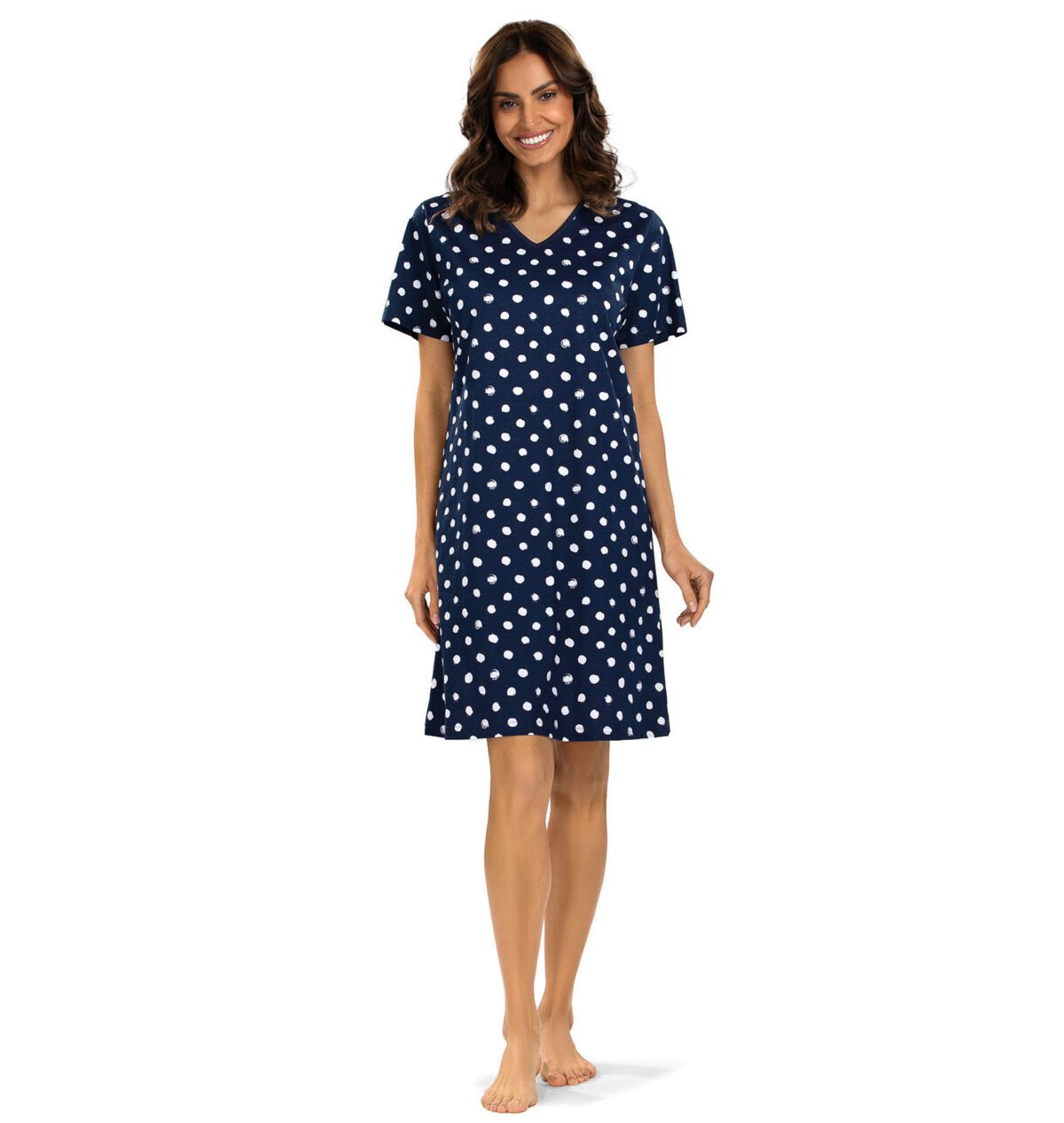 Breng comfort en stijl in je nachtroutine met het prachtige dames nachthemd van Comtessa. Dit elegante nachthemd in een diep donkerblauwe kleur is versierd met een speels doorlopend wit gestipt patroon, dat zorgt voor een frisse uitstraling.