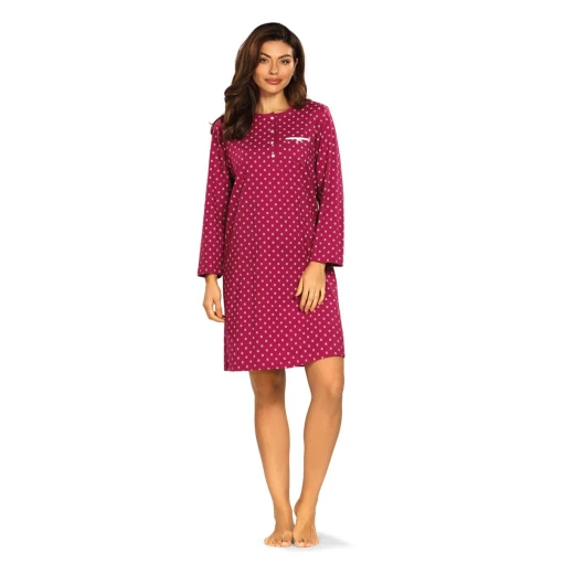 Een sierlijk dames nachthemd van Comtessa met lange mouwen en een perfecte pasvorm. De ronde hals heeft een knoopsluiting van 4 knopen. Dit bordeaux rood gekleurde nachthemd heeft een doorlopend fijn gebloemd patroon. Verder is het nachthemd ook voorzien van een borstzakje. De lengte van dit nachthemd is 100cm. Het is gemaakt van 100% gekamde katoen waardoor het een optimaal draagcomfort geeft voor de nacht!