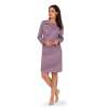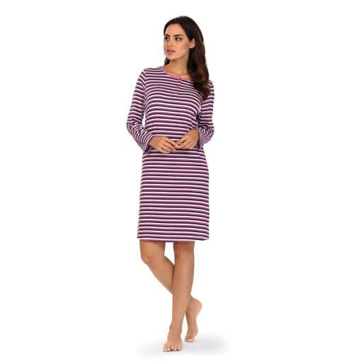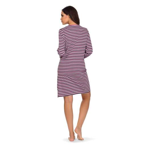 Dames nachthemd met lange mouwen van het merk Comtessa uit de ‘Moon Gazer’ collectie. Het nachthemd heeft een doorlopend paars-wit-zwart gestreept patroon en is voorzien van een ronde hals met een knoopsluiting van 3 knopen. De lengte is 100cm en het is gemaakt van 100% single jersey katoen!