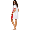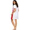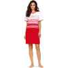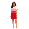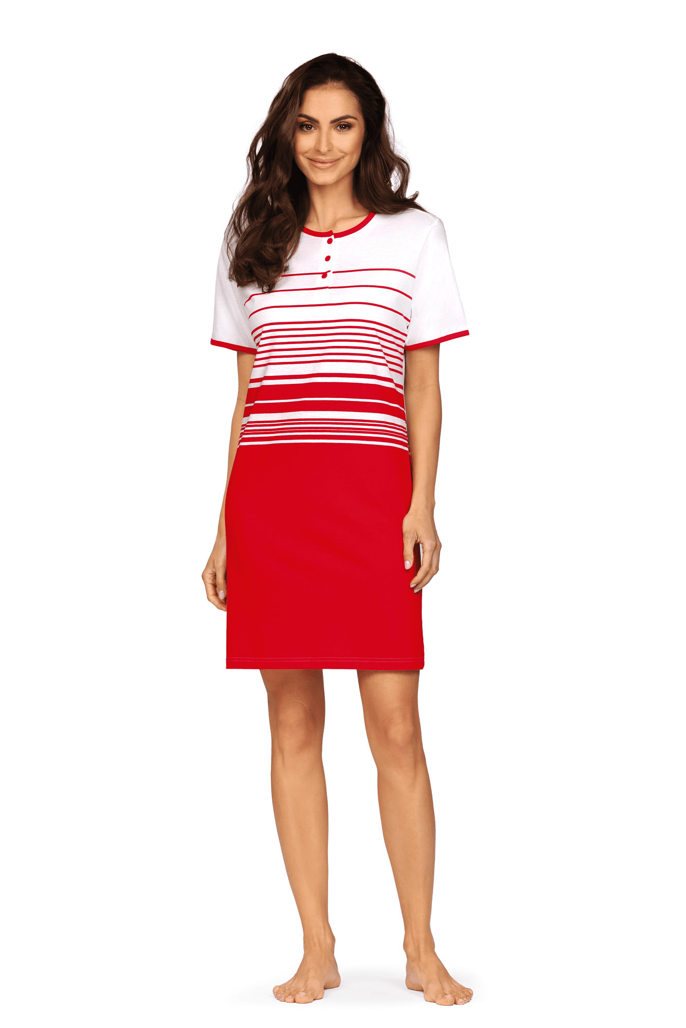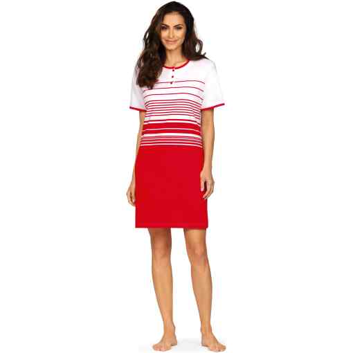 Een fraaie Comtessa dames nachthemd met korte mouwen. Het rood gestreepte nachthemd heeft een ronde hals met een knoopsluiting van 3 knopen en is afgewerkt met een rode rand. De uiteindes van de korte mouwen zijn ook afgewerkt met een rode rand. De lengte van dit nachthemd is 90cm en het is gemaakt van 100% single jersey katoen voor nog meer draagcomfort. Met dit nachthemd bent u klaar voor de warme nachten!