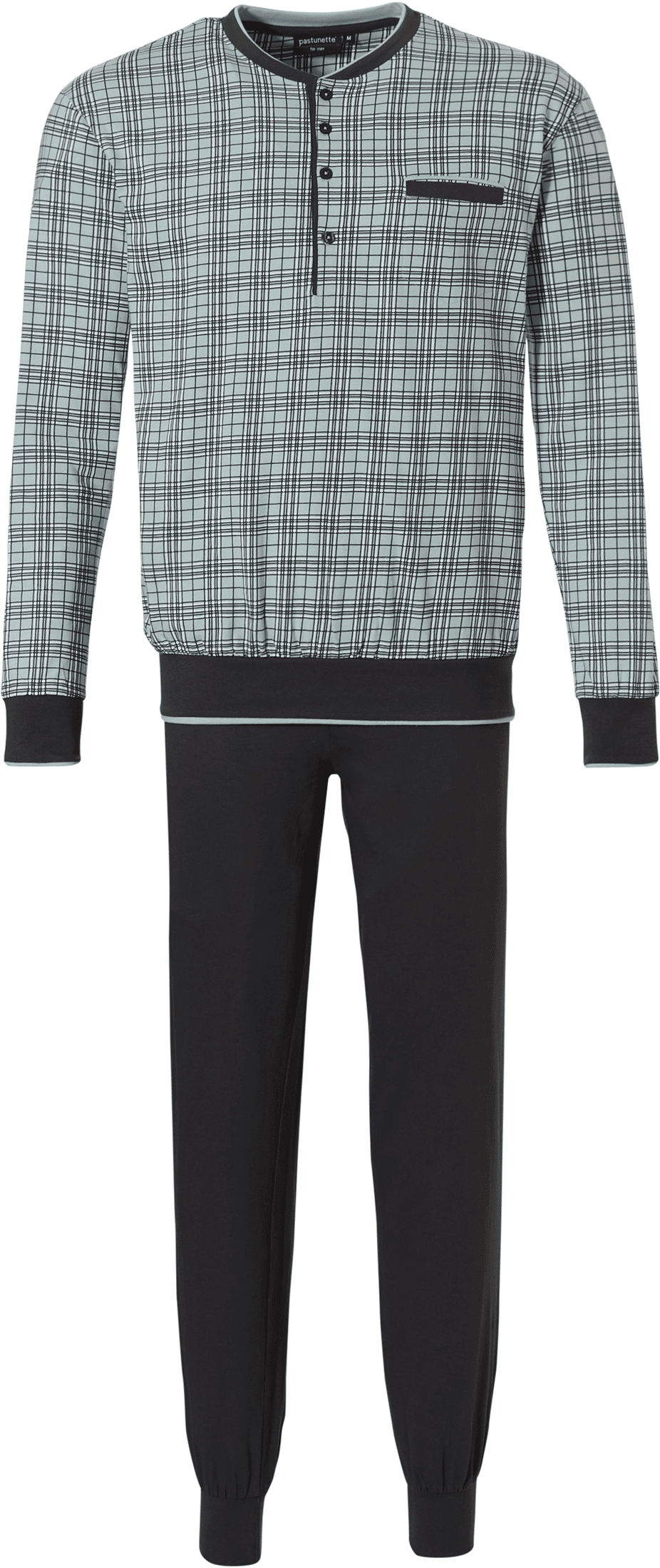 Ontdek de comfortabele damespyjama van het merk Comtessa, perfect voor een ontspannen nachtrust. De effen jadegroene top heeft lange mouwen en een ronde hals met een stijlvolle knoopsluiting van drie knopen, afgewerkt met een subtiele gestipte boord voor een elegante uitstraling. Aan de borst bevindt zich een handig borstzakje, dat het geheel extra detail geeft.