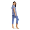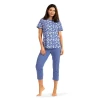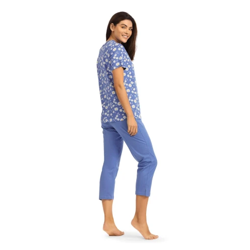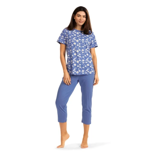 Ga stijlvol de nacht tegemoet met deze pyjama van Comtessa uit de ‘Flowers and Stripes’ collectie. Deze pyjama heeft korte mouwen en is gemaakt van 100% katoen. De ronde hals van de top heeft een knoopsluiting van 3 knopen en is met een blauwe boord afgewerkt. Verder heeft de pyjama een blauw gekleurde top met een fraai doorlopend gebloemd patroon. De effen blauwe 7/8e broek heeft een elastische rand in de taille. Welterusten!