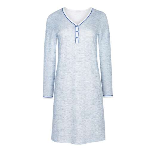 Een stijlvol blauw gemeleerd dames nachthemd van Cybéle met een perfecte pasvorm. De top heeft een v-hals met een knoopsluiting van 3 knopen die met een blauw-witte boord is afgewerkt. Het nachthemd heeft lange mouwen die ook zijn afgewerkt met een blauw-witte rand. Verder is het nachthemd gemaakt van 100% gekamde katoen waardoor het een extra fijne draagcomfort geeft. De lengte is 95cm.
