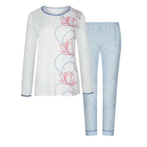 Deze stijlvolle Cybèle dames pyjama is gemaakt van 100% katoen. De wit met blauw gemêleerde top heeft een ronde hals zonder knoopsluiting en is afgewerkt met een blauwe boord. De lange mouwen zijn ook met blauwe boorden afgewerkt. Verder heeft de top aan één kant een fraai cirkel/bloemen patroon. De broek met elastische rand is blauw gemêleerd en heeft toelopende pijpen.
