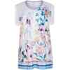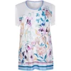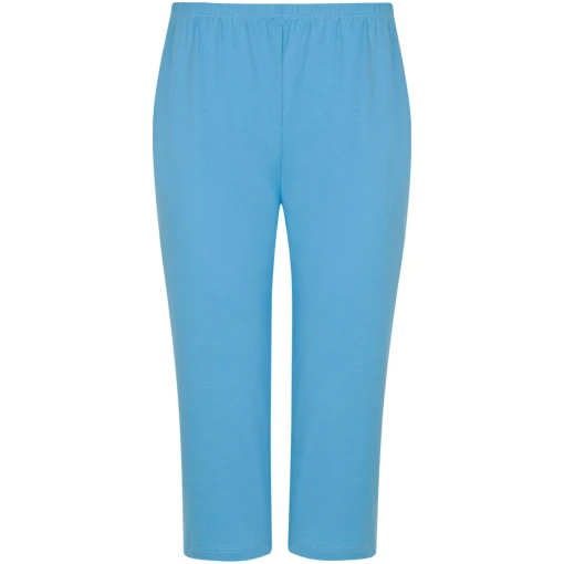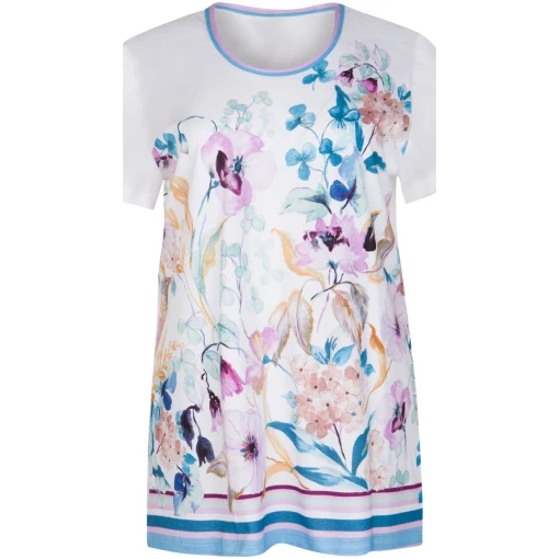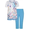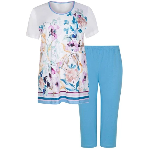 Deze stijlvolle zomers gekleurde dames pyjama van Cybèle heeft korte mouwen en een perfecte pasvorm. De ronde hals heeft geen knoopsluiting en is afgewerkt met een blauw-roze boord. Deze wit gekleurde pyjama heeft aan de voorkant een bloemen patroon en is aan de onderkant afgewerkt met gekleurde horizontale strepen. Bij deze set zit een licht blauwe broek met driekwart lengte die tot over de knie komt. Verder is het gemaakt van 100% gekamde katoen waardoor het een fijne draagcomfort geeft. Klaar voor de zomerse nachten!