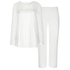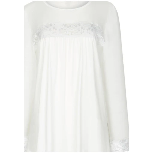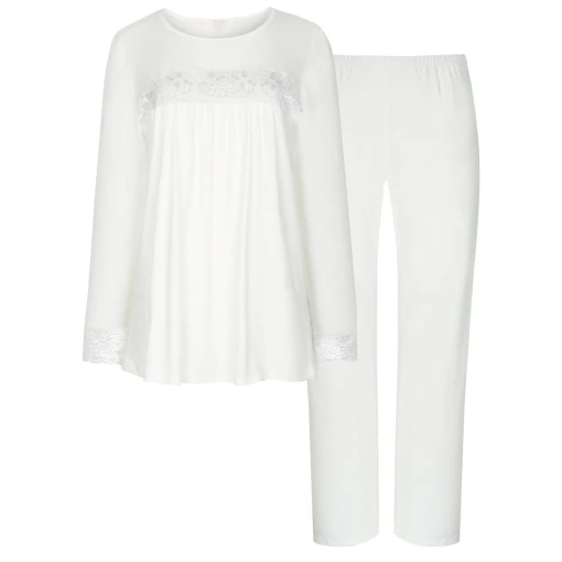 Een dames pyjama uit de Luxurious collectie van Cybèle. Deze stijlvolle ivoor kleurige pyjama heeft lange mouwen en een perfect pasvorm. Op de borst zit een chique stuk kant wat met een subtiele plooiing is afgewerkt. De lange mouwen zijn ook aan de uiteindes afgewerkt met kant. De broek van deze zet heeft een elastische taille. Deze pyjama met ronde hals is gemaakt van een zijde zachte 100% Biologische katoen waardoor dit extra fijn draagt.