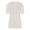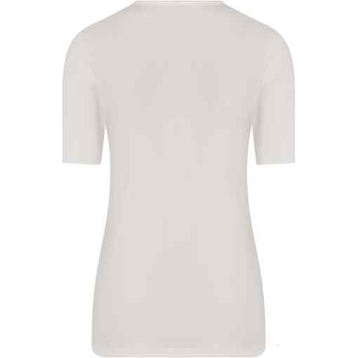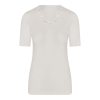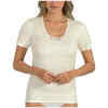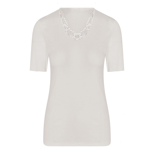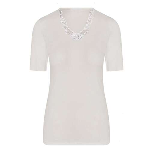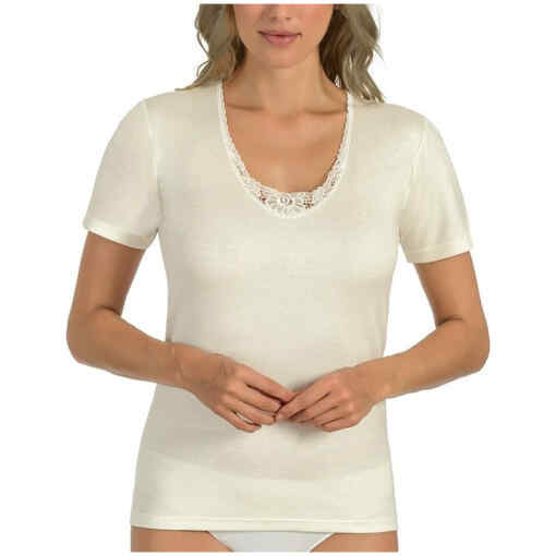 Een heerlijk warm dames onderhemd van Entex met korte mouwen in een zachte roomwitte kleur. Dit hemd is gemaakt van een mix van katoen, acryl, polyamide en wol waardoor het zeer aangenaam dragen is en veel warmte biedt. De binnenkant is van geruwd katoen waardoor het niet gaat kriebelen. Verder is dit wol wit kleurige hemd stijlvol afgewerkt met kant waardoor het ideaal te dragen is onder uw dagelijkse kleding. Met dit hemd bent u klaar voor de koudere dagen!