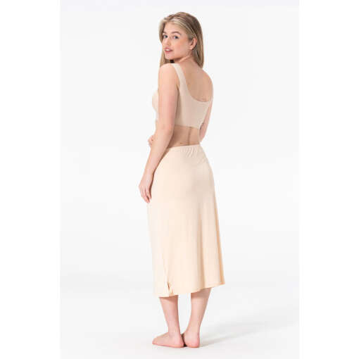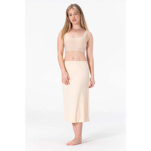 De lange lengte met split geeft je extra bewegingsvrijheid en een elegante uitstraling onder al je jurken en rokken. Materiaal samenstelling: 85% Polyamide, 15% Elastaan. Voeg deze veelzijdige onderrok toe aan je garderobe voor een strakke, verzorgde look en optimaal comfort gedurende de hele dag!