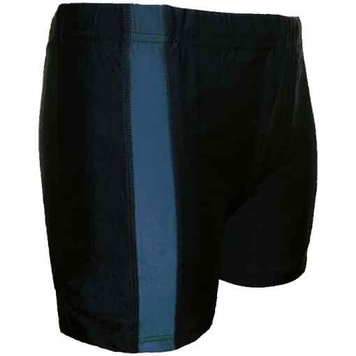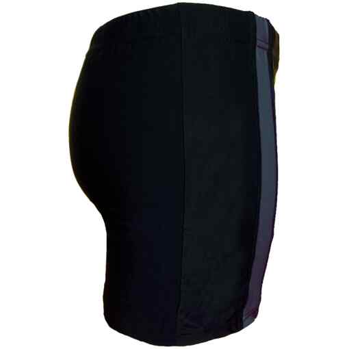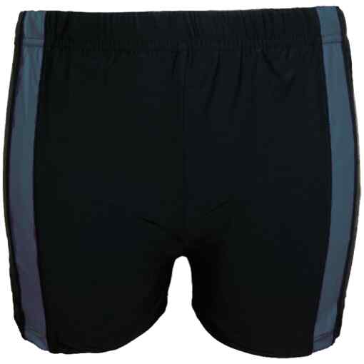 Deze effen zwarte heren zwembroek heeft aan beide zijkanten een grijs gekleurde strook. De zwembroek met pijpjes is voorzien van een voering van voren en het heeft een aantrekkoord.