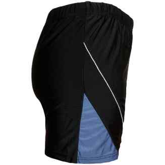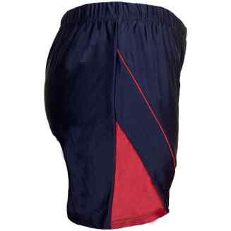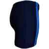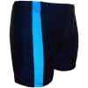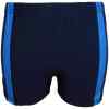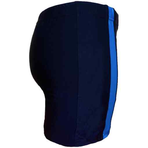Deze effen donker blauwe heren zwembroek heeft aan beide zijkanten een licht blauw gekleurde strook. De zwembroek met pijpjes is voorzien van een voering van voren en het heeft een aantrekkoord.