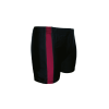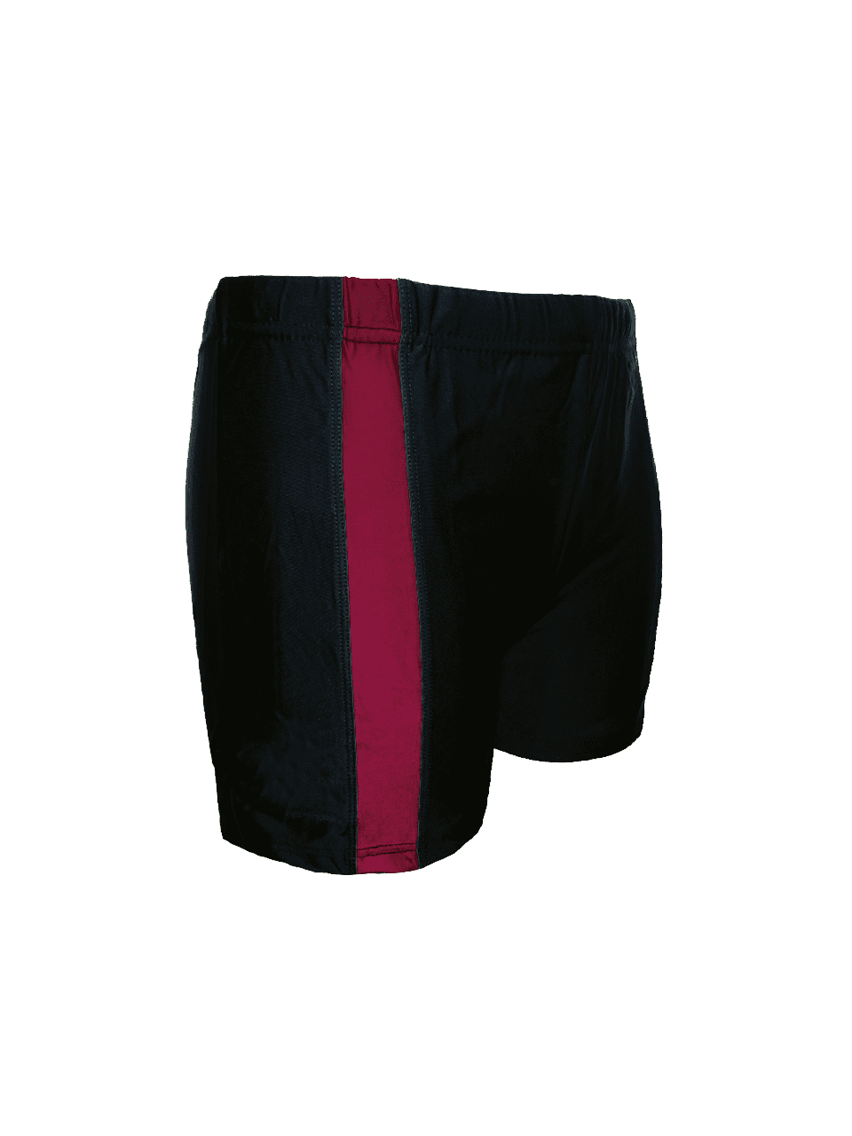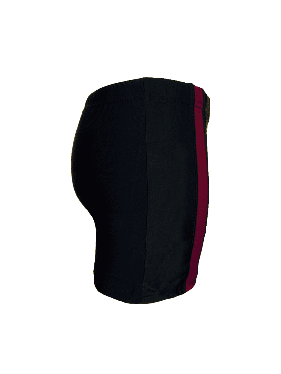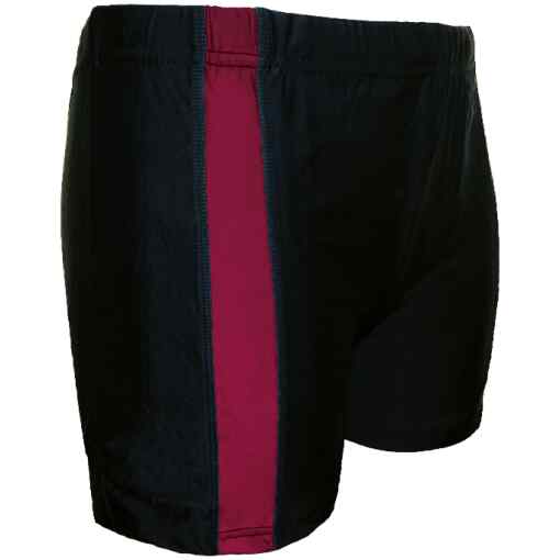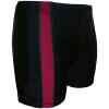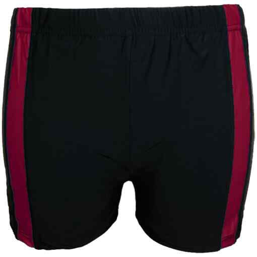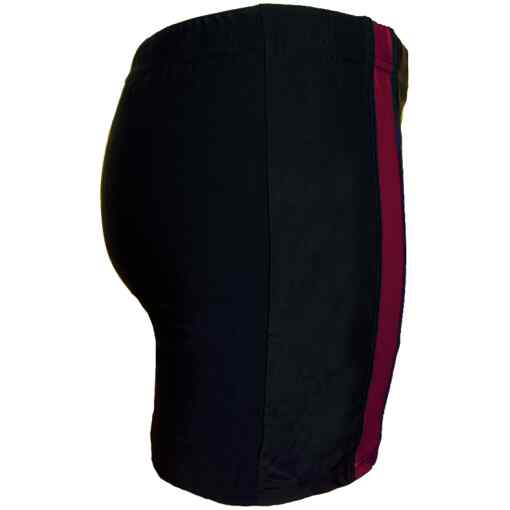 Deze effen zwarte heren zwembroek heeft aan beide zijkanten een bordeaux rood gekleurde strook. De zwembroek met pijpjes is voorzien van een voering van voren en het heeft een aantrekkoord.