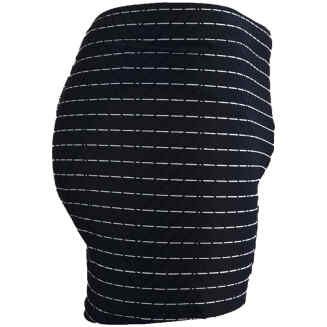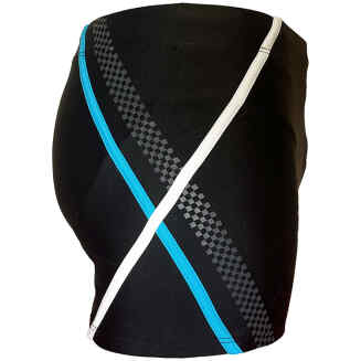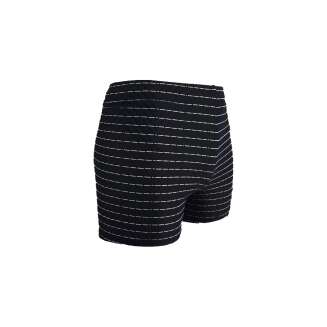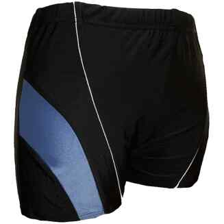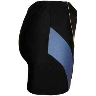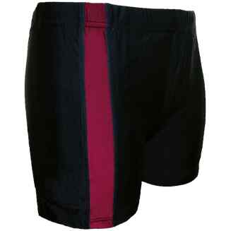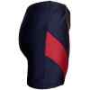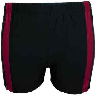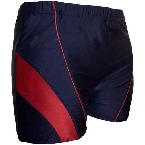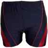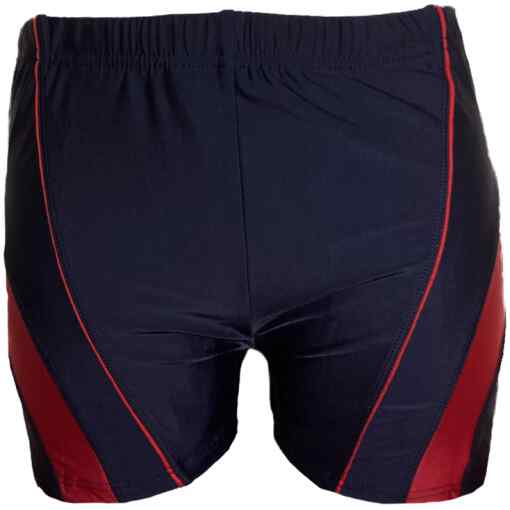 Een effen donker blauwe heren zwembroek met aan beide zijkanten een rood gekleurd vlak en een streep. De zwembroek met pijpjes is voorzien van een voering van voren en het heeft een aantrekkoord.