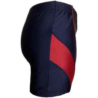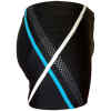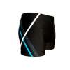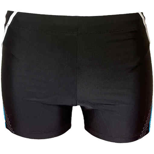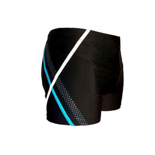 Een zwarte heren zwembroek van Bomain met aan de zijkanten een wit-blauw gekleurde streep en een sportief geblokt grijs patroon. De zwembroek met pijpjes is voorzien van een binnenslip en het heeft een aantrekkoord.