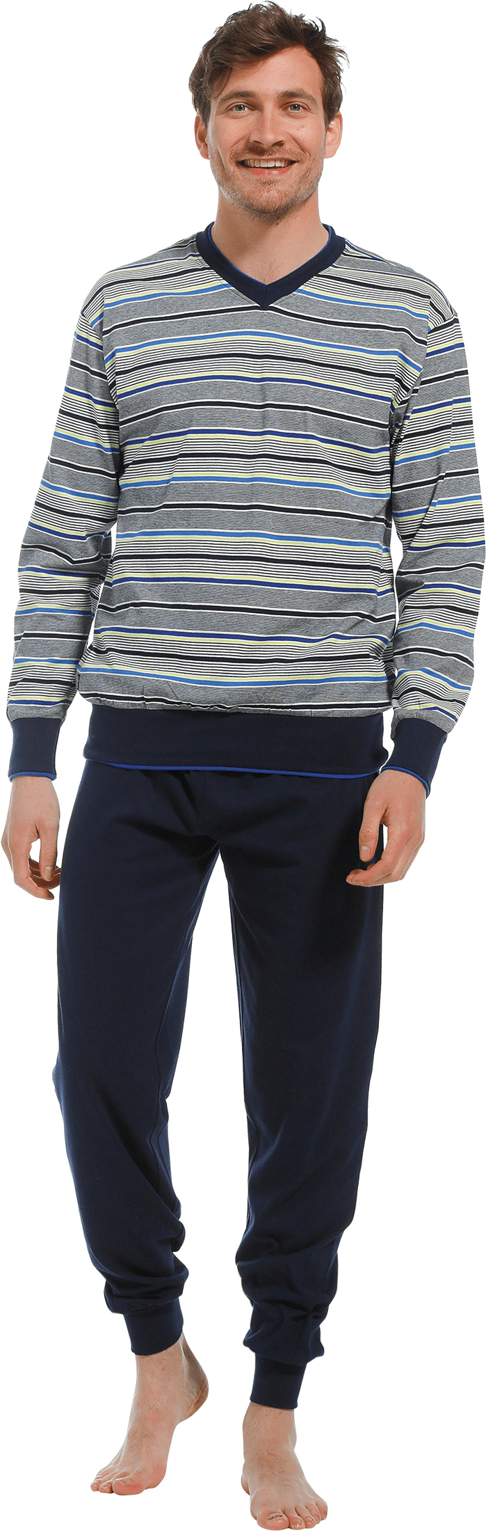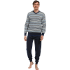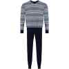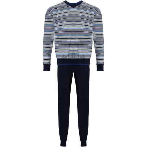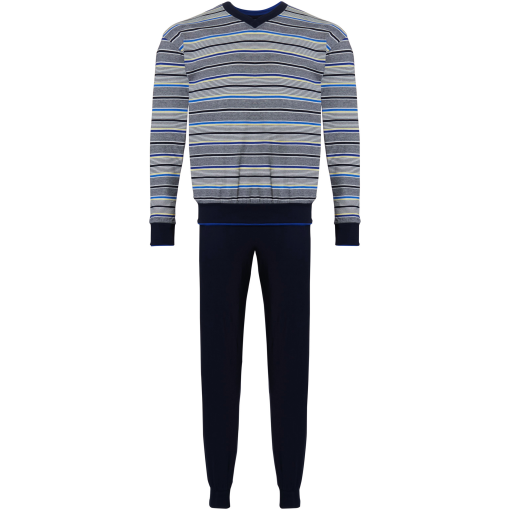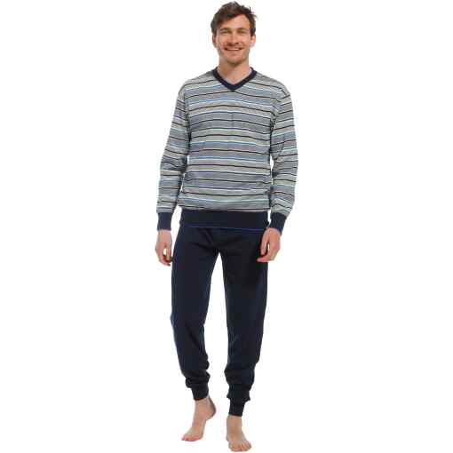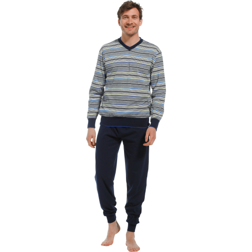 Heren pyjama van Pastunette for Men gemaakt van 100% katoen! De licht gekleurde top met streep patroon heeft een V-hals zonder knopen die met een donker blauwe boord is afgewerkt. De lange mouwen, onderkant van de top en uiteindes van de pijpen zijn afgewerkt met donker blauw gekleurde boorden. De effen donkere broek is voorzien van een elastische taille.