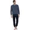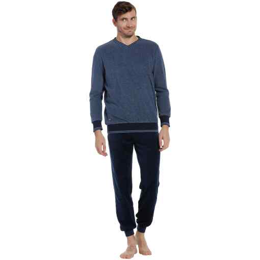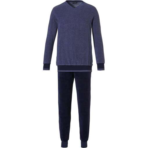Pastunette for Men warme heren pyjama voor de koude nachten. De blauw gekleurde badstof top heeft een V-hals die is afgewerkt met een blauw gestreepte boord. De velours broek heeft een zak aan de achterkant en een elastische rand in de taille. De boorden aan de mouwen, uiteindes van de pijpen en onderkant van de top zijn van elastaan voor een betere pasvorm en meer draagcomfort!