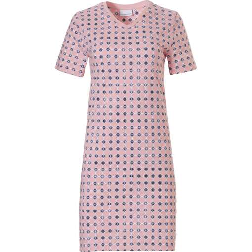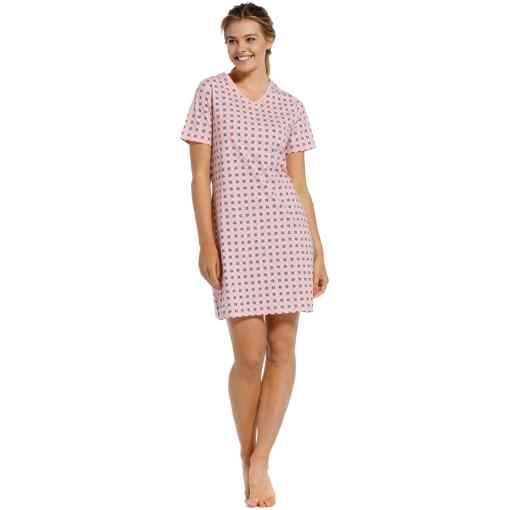 Een zacht roze gekleurd dames nachthemd van Pastunette met cirkel patroon. Dit stijlvolle nachthemd heeft korte mouwen en een perfecte pasvorm. De v-hals heeft geen knoopsluiting en is afgewerkt met een roze boord. De lengte van dit nachthemd is 95cm. Verder is het gemaakt van 100% katoen waardoor het een fijne draagcomfort geeft!