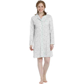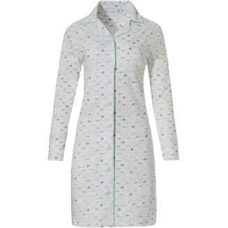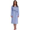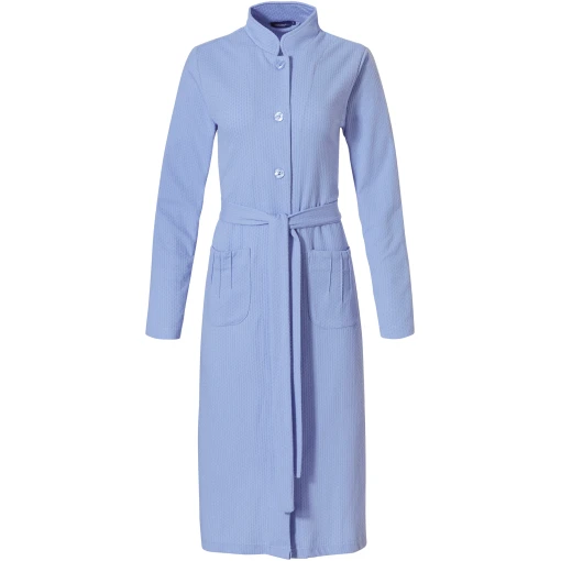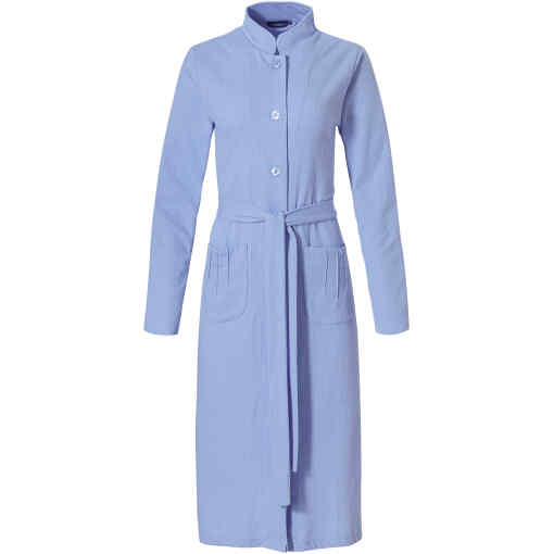 Een stijlvolle licht blauwe dames ochtendjas van het merk Pastunette. De jas heeft een knoopsluiting en is ook voorzien van een ceintuur. De jas heeft een opstaande kraag. Verder zitten er aan beide voorzijdes opgestikte zakken. De lengte is 115cm en het is gemaakt van 60% katoen – 40% polyester jacquard!