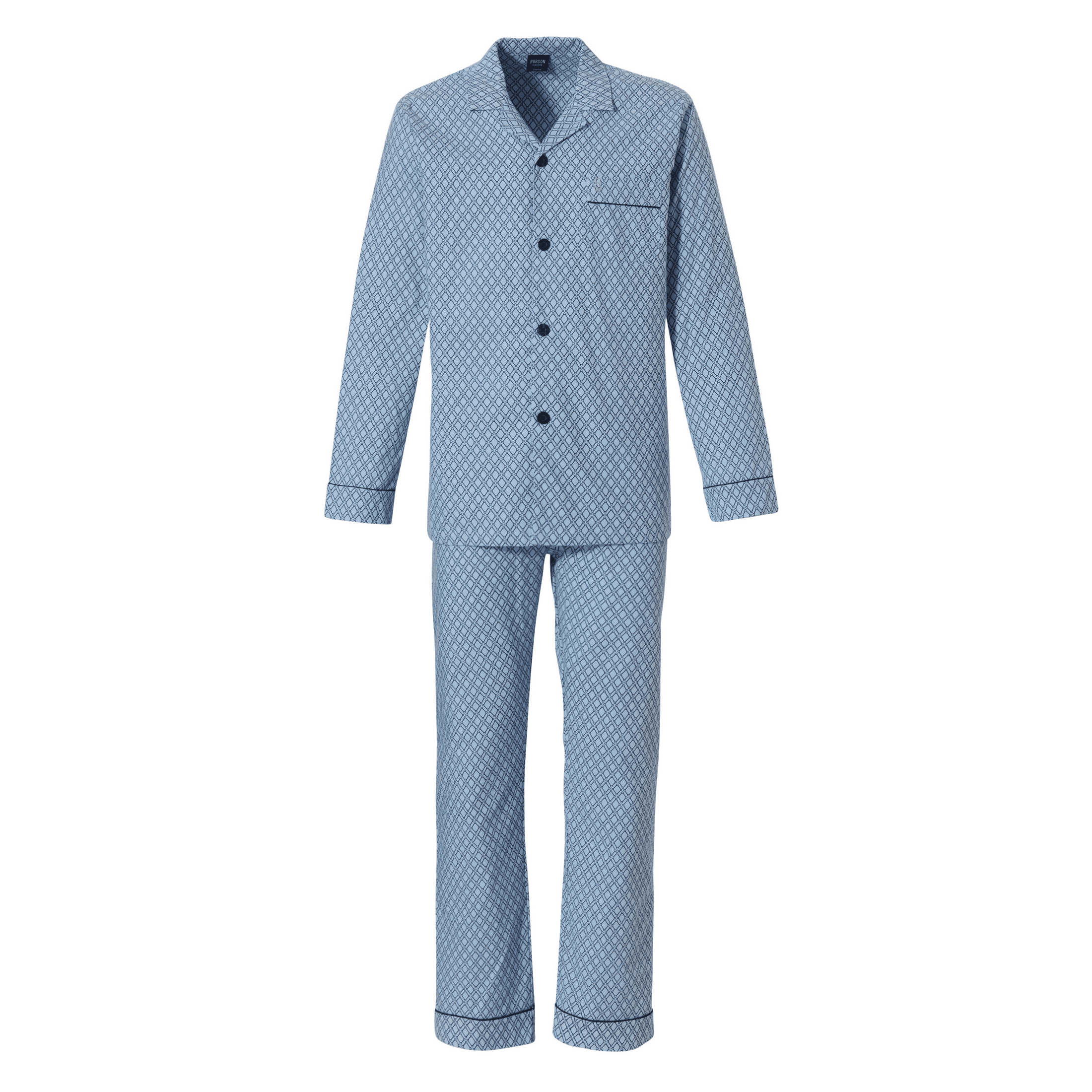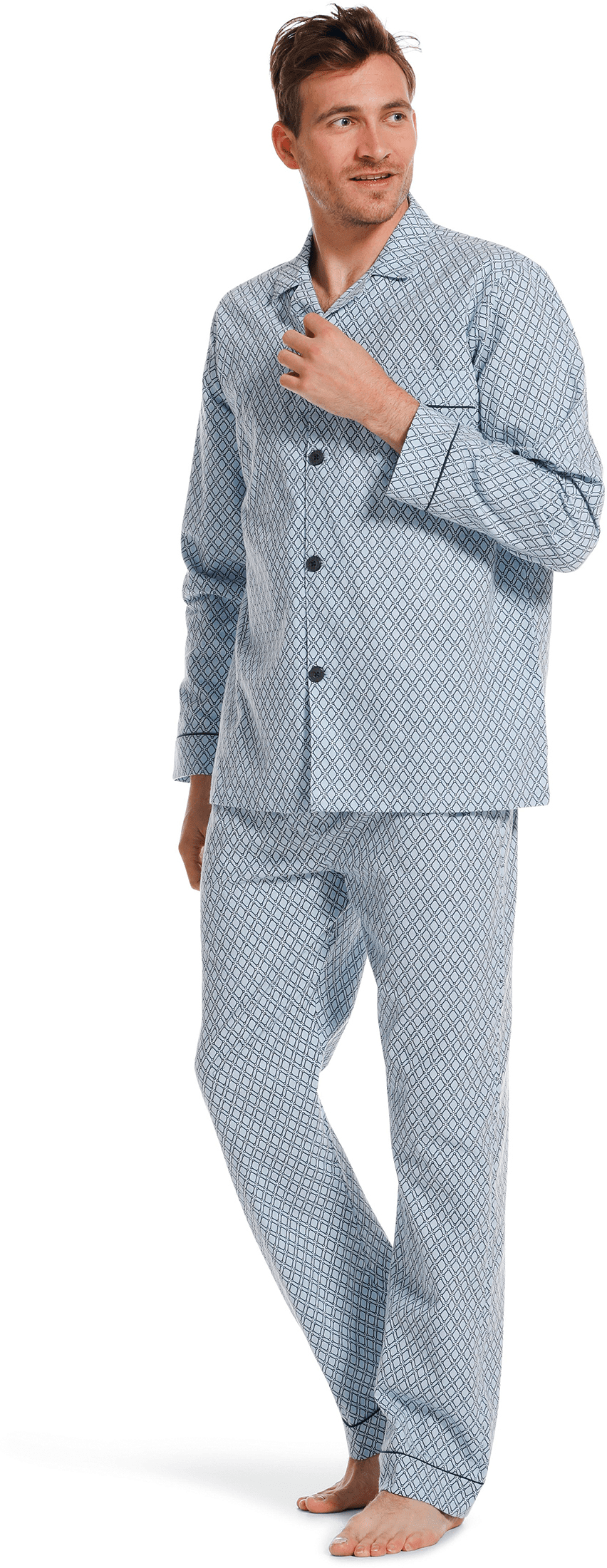 Een heren pyjama van het merk Robson gemaakt van 100% katoen flannel! De top met kraag is voorzien van een doorknoopsluiting. Deze licht blauw gekleurde pyjama met doorlopend grafisch patroon heeft ook een borstzakje. De lange broek is voorzien van een elastische taille.