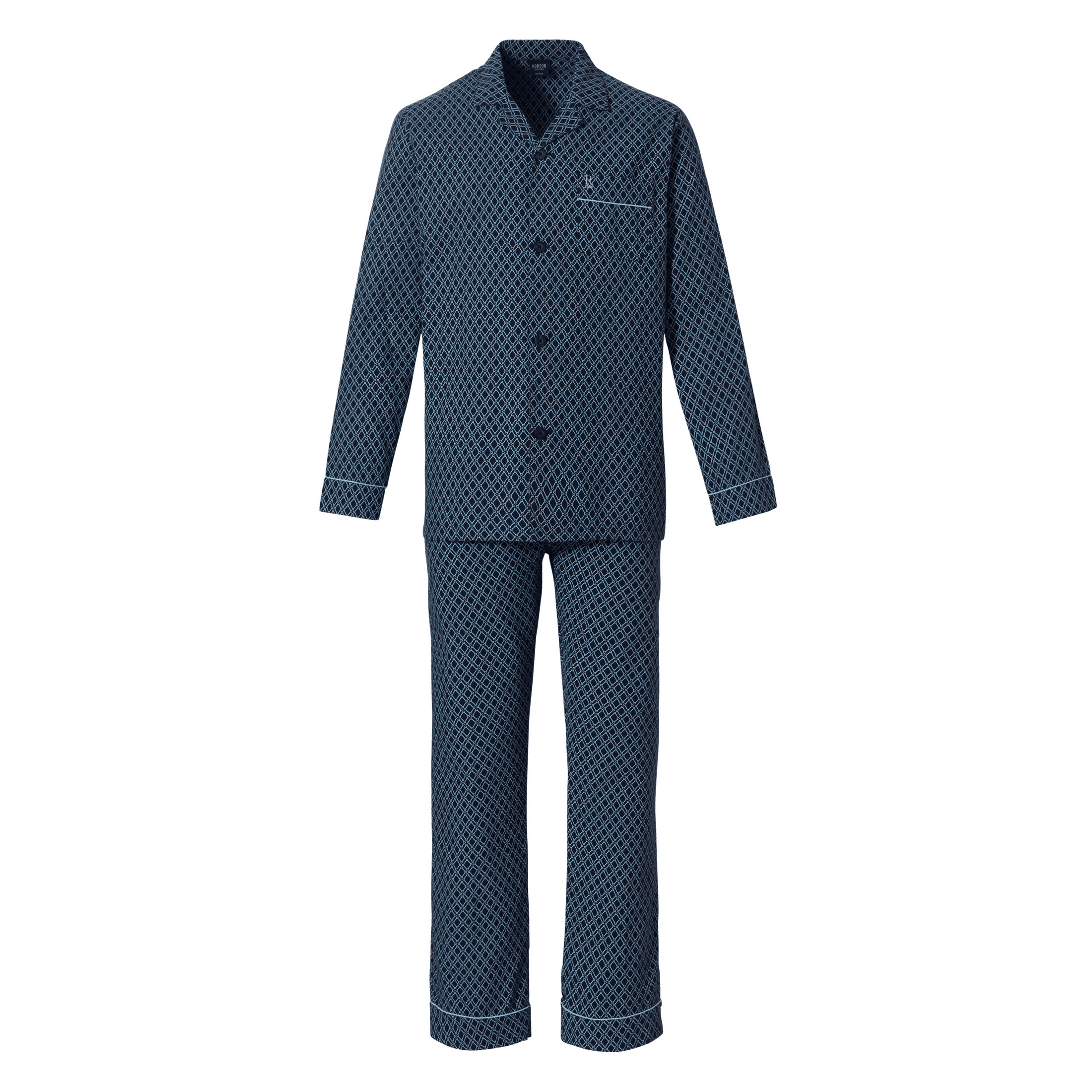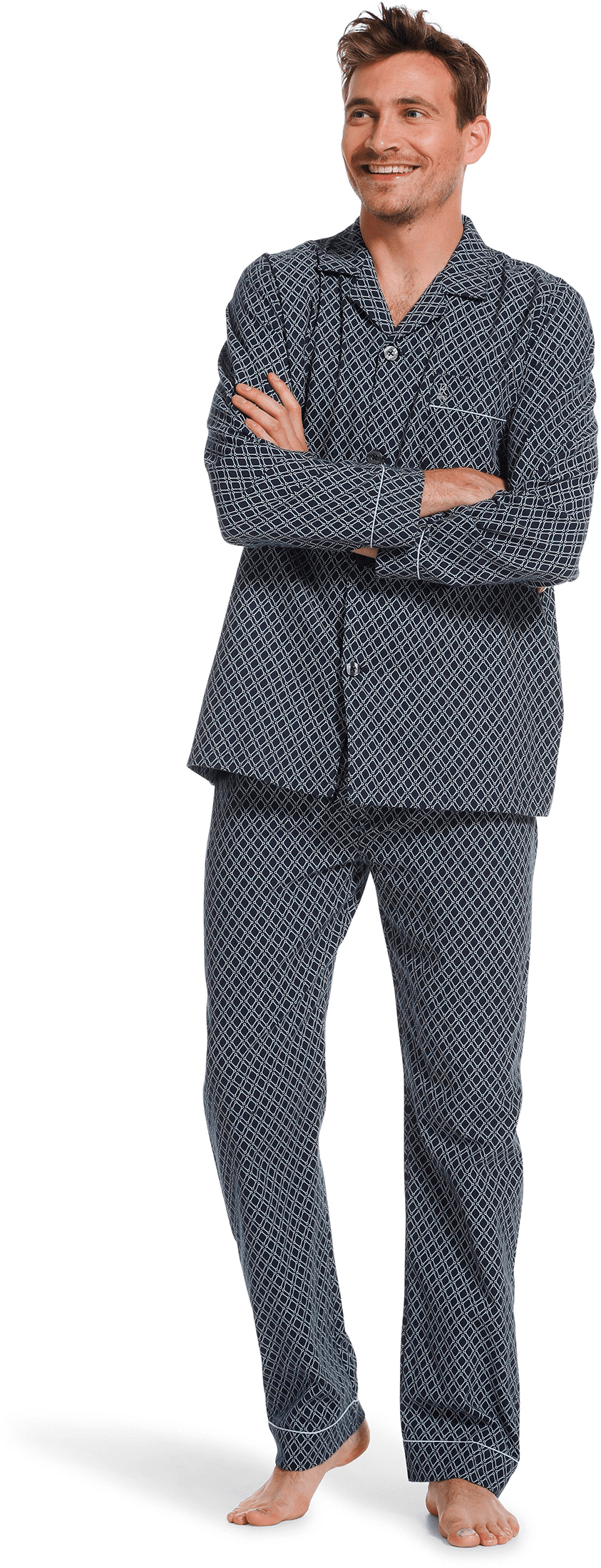 Een heren pyjama van het merk Robson gemaakt van 100% katoen flannel! De top met kraag is voorzien van een doorknoopsluiting. Deze donker blauw gekleurde pyjama met doorlopend grafisch patroon heeft ook een borstzakje. De lange broek is voorzien van een elastische taille.