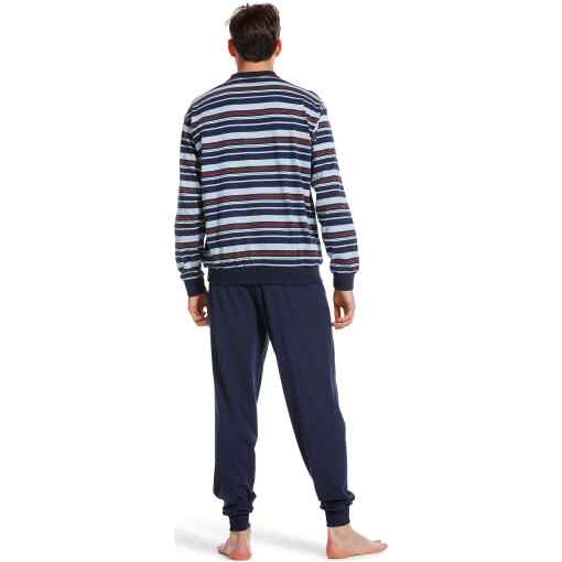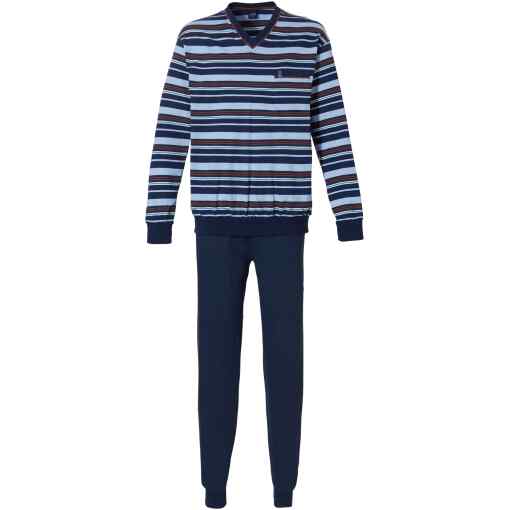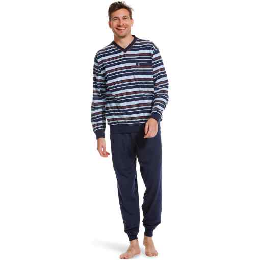 Deze licht gekleurde heren pyjama met streep patroon van Robson heeft een perfect pasvorm! De top heeft een v-hals zonder knoopsluiting die is afgewerkt met een donker blauwe boord. Verder zijn de mouwen, onderkant van de top en de uiteindes van de pijpen afgewerkt met blauw gekleurde boorden. De effen blauwe broek is voorzien van een elastische taille.
