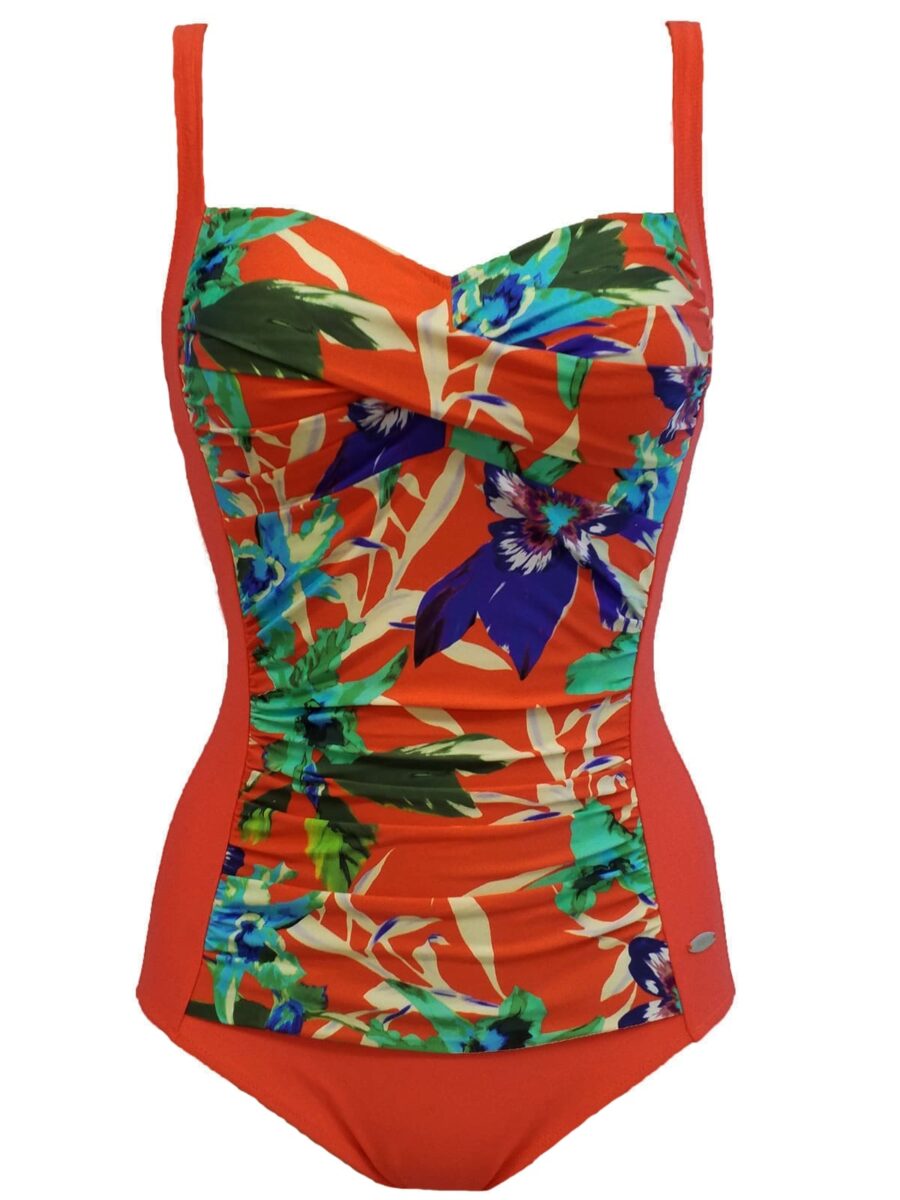 Een stijlvol badpak met cups van het merk Susa uit de ‘Caribbean Dreams’ collectie. Dit caribische rood gekleurde model met gebloemd patroon heeft een rechte hals en is doorlopend geplooid waardoor het extra sierlijk kleed. De achterkant van dit badpak is effen gekleurd en heeft een rechte achterkant met verstelbare bandjes.