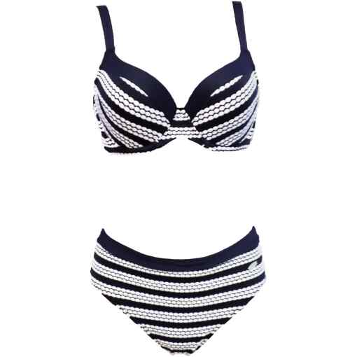 Deze fraaie donker blauwe bikini met geborduurd wit patroon van Susa komt uit de ‘Marina’ collectie. De voorgevormde top met beugel heeft een zachte ondersteuning en is voorzien van verstelbare banden. Het brede donker blauwe broekje heeft aan de voorkant hetzelfde wit geborduurde patroon. Ook is het broekje van deze bikini met perfecte pasvorm van voren gevoerd. Zo bent u klaar voor de zomer!